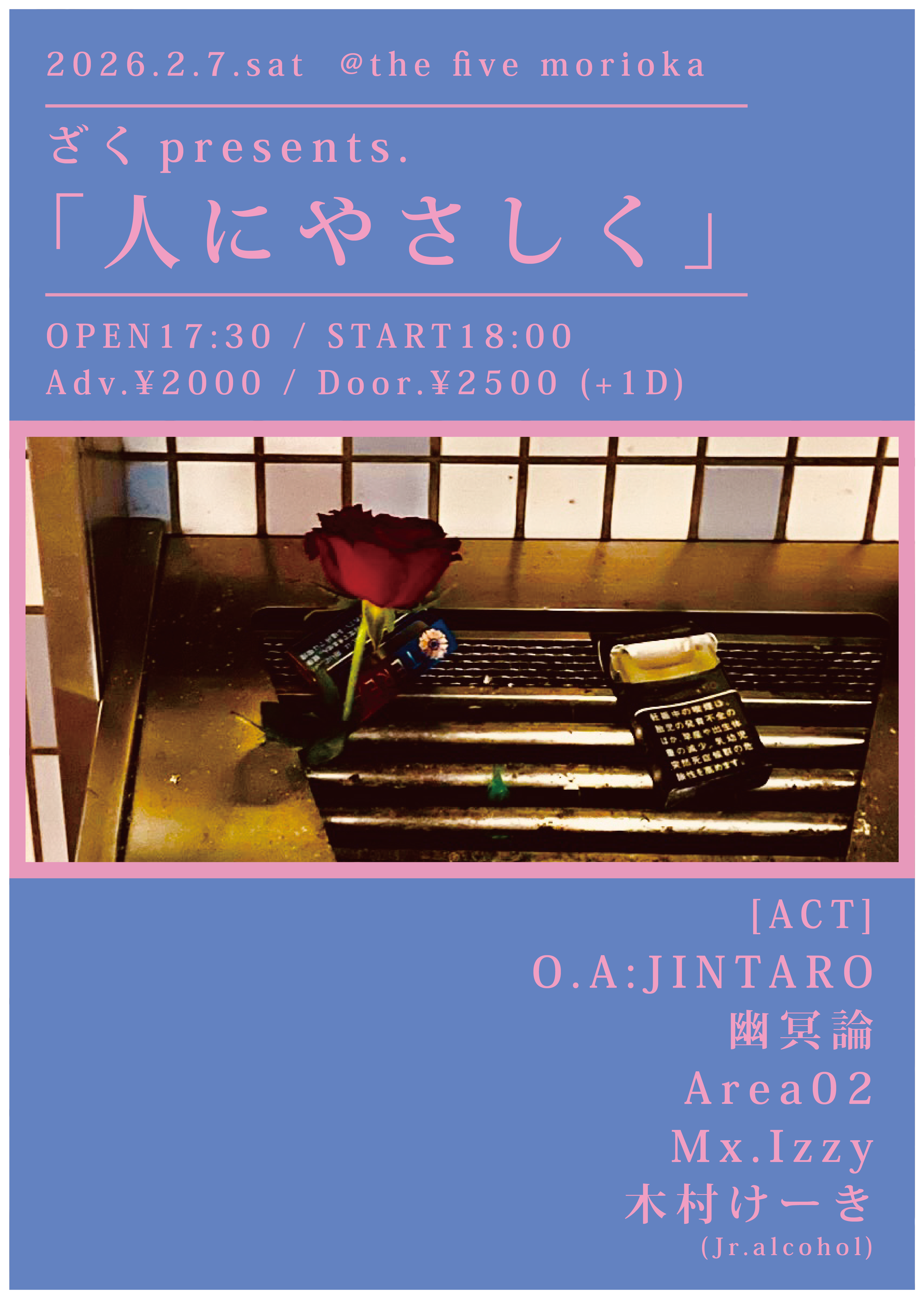 ざくpresents. [addtoany] 2026/02/07START18:00OPEN17:30 @the five morioka タイトル ざくpresents.「人にやさしく」 料金 前売¥2,000 / 当日¥2,500 (+1D ¥600) 出演者 O.A:JINTARO / 幽冥論 / Area02 / Mx.Izzy / 木村けーき(Jr.alcohol) お問い合わせ 019-601-6931(the five morioka) TICKET 出演バンド予約 / 会場メール予約