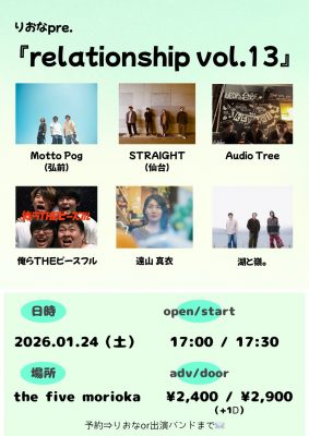 りおなpre. [addtoany] 2026/01/24START17:30OPEN17:00 @the five morioka タイトル 『relationship vol.13』 料金 前売¥2,400 / 当日¥2,900 (+1D ¥600) 出演者 Motto Pog(弘前) / STRAIGHT(仙台) / Audio Tree / 俺らTHEピースフル / 遠山真衣 / 湖と嶺。 お問い合わせ 019-601-6931(the five morioka) TICKET 出演者予約 / 会場メール予約