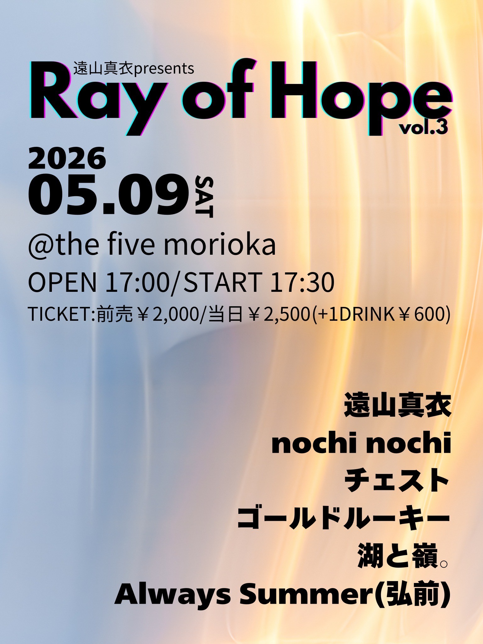 遠山真衣presents [addtoany] 2026/05/09START17:30OPEN17:00 @the five morioka タイトル 遠山真衣presents 『Ray of Hope vol.3』 料金 前売¥2,000 / 当日¥2,500 (+1D ¥600) 出演者 遠山真衣 / nochi nochi / チェスト / ゴールドルーキー / 湖と嶺。 / Always Summer(弘前) お問い合わせ 019-601-6931(the five morioka) TICKET 出演者予約 / 会場メール予約