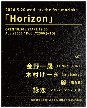 金野一晟(FUNNY THINK) / 木村けーき(Jr.alcohol) / 麗(眠る青) / 詠恋(ノルハルマンと天使) [addtoany] 2026/05/20START19:00OPEN18:30 @the five morioka タイトル 「Horizon」 料金 前売¥2,000 / 当日¥2,500 (+1D ¥600) 出演者 金野一晟(FUNNY THINK) / 木村けーき(Jr.alcohol) / 麗(眠る青) / 詠恋(ノルハルマンと天使) お問い合わせ 019-601-6931(the five morioka) TICKET 会場メール予約 / 出演者予約