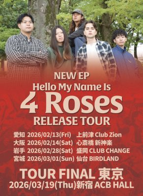 4 Roses [addtoany] 2026/02/28 未定 @Club Change タイトル 4 Roses NEW EP “Hello My Name Is 4 Roses” Release Tour 料金 未定 出演者 4 Roses / and more... お問い合わせ 019-652-7182(Club Change) TICKET 出演バンド予約 / 会場メール予約 >4 Roses