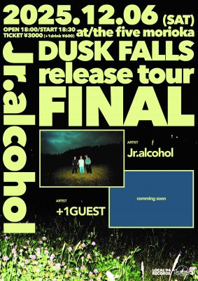 Jr.alcohol / +1GUEST [addtoany] 2025/12/06START18:30OPEN18:00 @the five morioka タイトル Jr.alcohol "DUSK FALLS" release tour FINAL 料金 前売¥3,000 (+1D ¥600) 出演者 Jr.alcohol / +1GUEST お問い合わせ 019-601-6931(the five morioka) TICKET ■e+:https://eplus.jp/sf/detail/4412300001-P0030001 ■出演者予約 ■会場メール予約 >Jr.alcohol HP