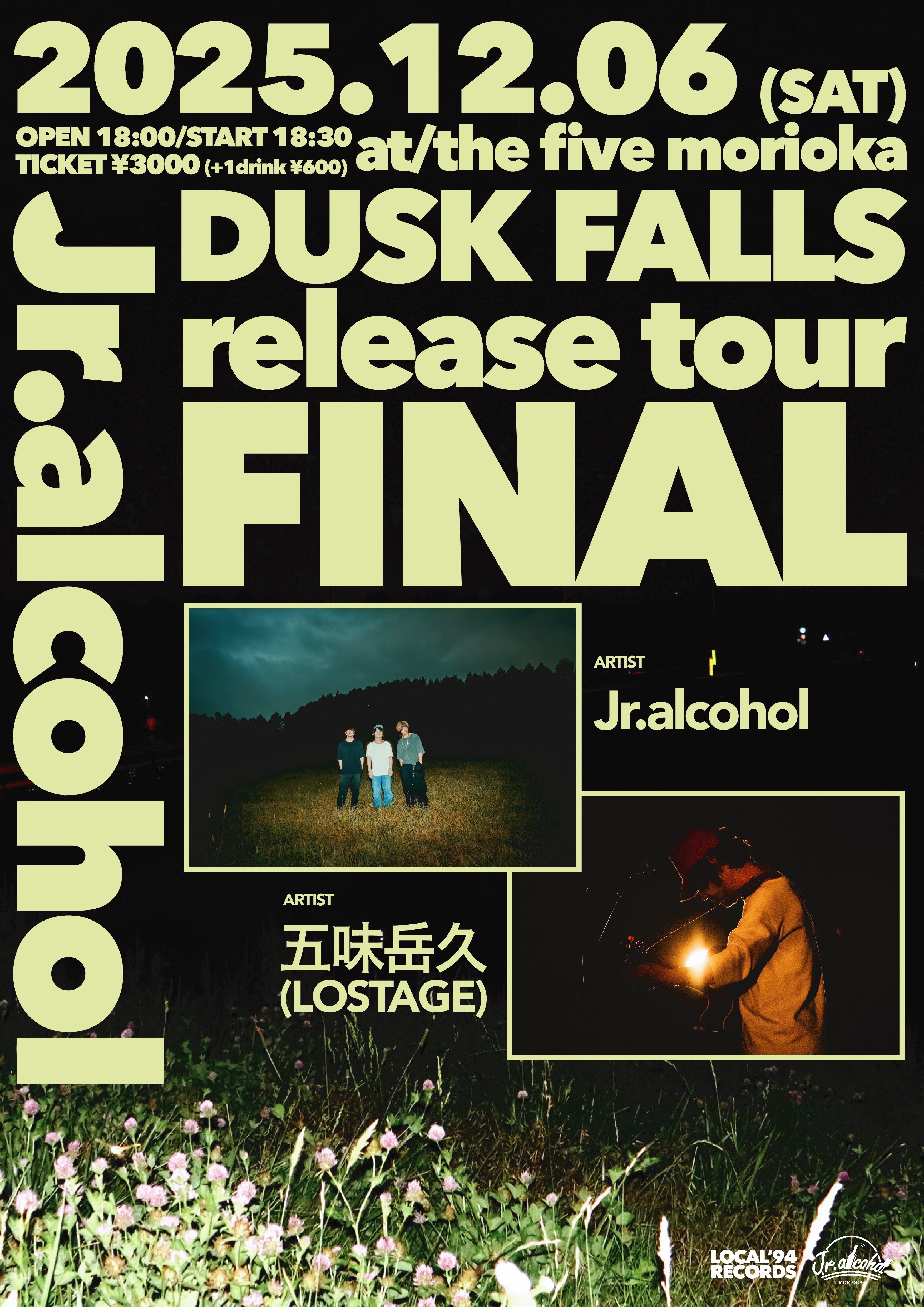 Jr.alcohol / 五味岳久(LOSTAGE) [addtoany] 2025/12/06START18:30OPEN18:00 @the five morioka タイトル Jr.alcohol "DUSK FALLS" release tour FINAL 料金 前売¥3,000 (+1D ¥600) 出演者 Jr.alcohol / 五味岳久(LOSTAGE) お問い合わせ 019-601-6931(the five morioka) TICKET ■e+:https://eplus.jp/sf/detail/4412300001-P0030001 ■出演者予約 ■会場メール予約 >Jr.alcohol HP
