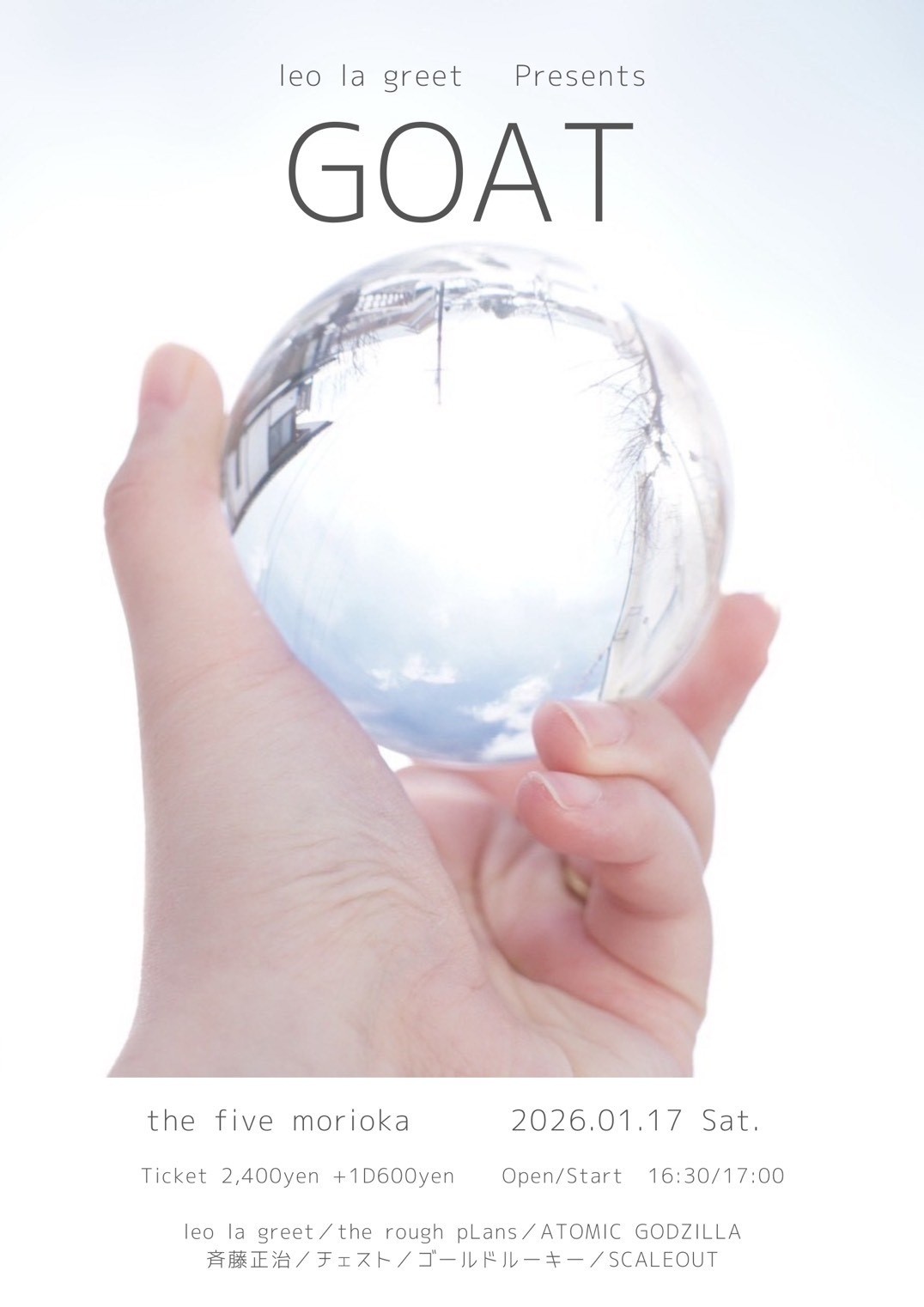 leo la greet Presents [addtoany] 2026/01/17START17:00OPEN16:30 @the five morioka タイトル leo la greet Presents「GOAT」 料金 前売¥2,400 / 当日¥2,900 (+1D ¥600) 出演者 leo la greet / the rough pLanS / ATOMIC GODZILLA / 斉藤正治 / チェスト / ゴールドルーキー / SCALEOUT お問い合わせ 019-601-6931(the five morioka) TICKET 出演バンド予約 / 会場メール予約
