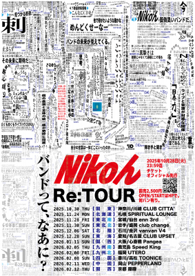 Nikoん [addtoany] 2025/11/30START18:00OPEN17:30 @Club Change タイトル Nikoん「Re:TOUR」 料金 前売¥2,500 (+1D ¥600) 出演者 Nikoん / 対バン有り お問い合わせ 022-256-1000(ノースロードミュージック) TICKET ■オフィシャル先行(2025/10/28/23:59迄) https://eplus.jp/nikon/ >ノースロードミュージック