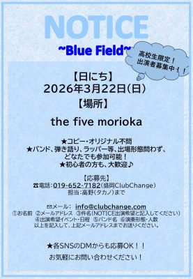 NOTICE~Blue Field~ [addtoany] 2026/03/22START13:30OPEN13:00 @the five morioka タイトル NOTICE~Blue Field~ 料金 オールスタンディング 前売700円 当日1200円(+1D 600円) 出演者 未定 お問い合わせ 019-601-6931(the five morioka) TICKET 出演者予約 / 会場メール予約 NOTICEHPはこちら♪