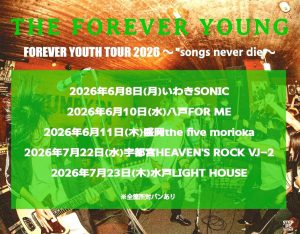 THE FOREVER YOUNG [addtoany] 2026/06/11 未定 @the five morioka タイトル THE FOREVER YOUNG presents FOREVER YOUTH TOUR 2026 "songs never die" 料金 未定 出演者 THE FOREVER YOUNG / ※対バンあり お問い合わせ 019-601-6931(the five morioka) TICKET 詳細未定 >THE FOREVER YOUNG HP