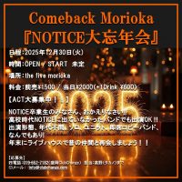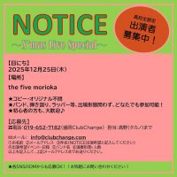 NOTICE~X’mas Live Special~ 25 12月 2025 1:00 PM 会場: the five morioka TICKET 出演者予約 / 会場メール予約 ※“夜観飛行”は都合によりキャンセルとなりました。 … 続きを読む NOTICE~X’mas Live Special~