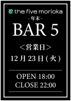 -年末- BAR 5 23 12月 2025 6:00 PM 会場: the five morioka ※営業時間 OPEN 18:00 / CLOSE 22:00 ※BARカウンターのみでの営業となります &nb … 続きを読む -年末- BAR 5