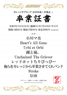 小川マ美 / Heart's All Gone / Urbi et Orbi / 湖と嶺。 / Stroke / XOR / Unchained The Griever / レッドホットちりぴっぴー / 俺らをカレッジから卒業させてくれバンド